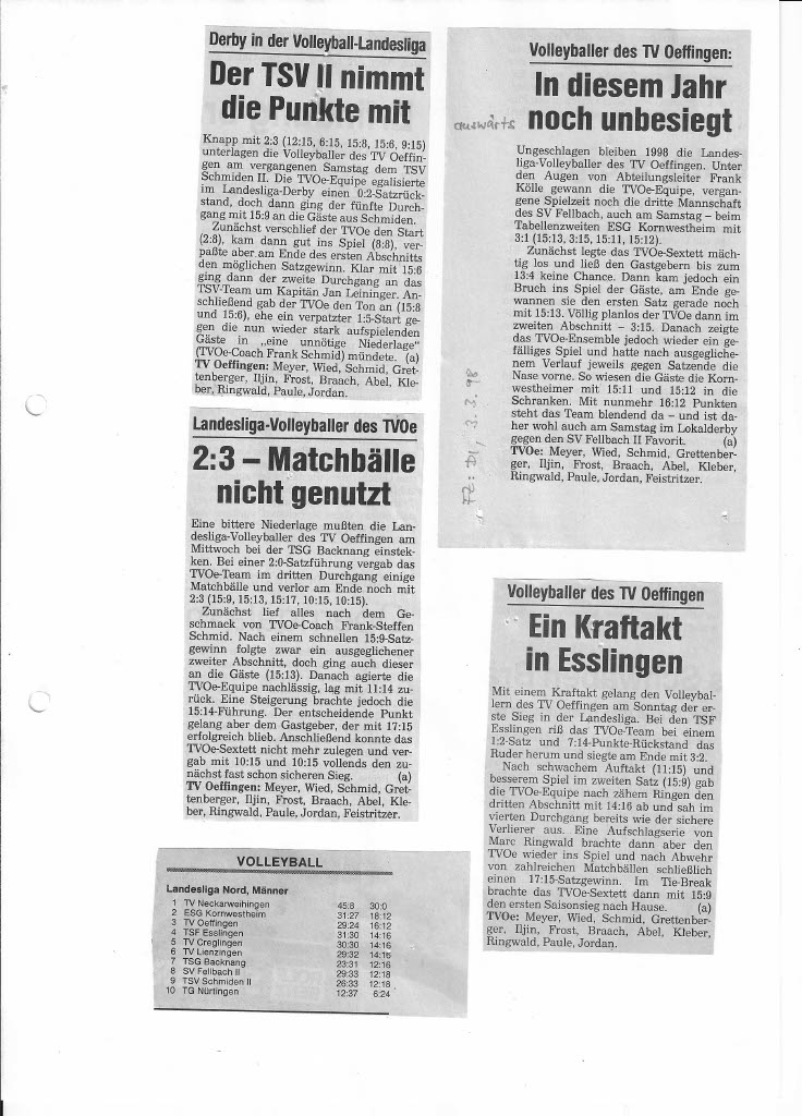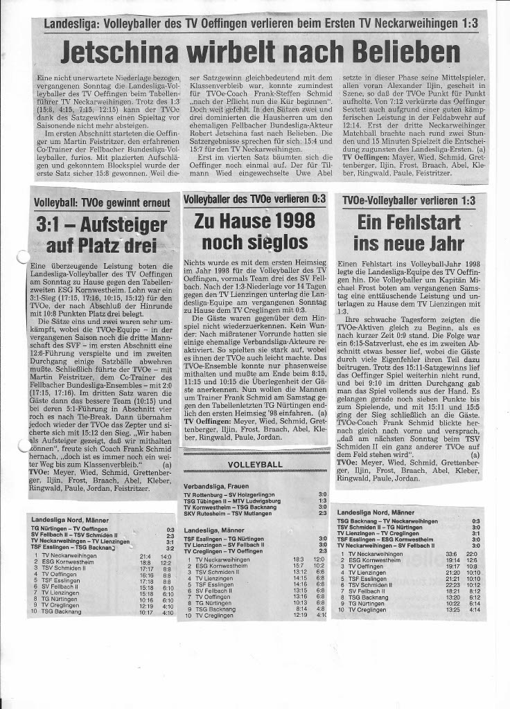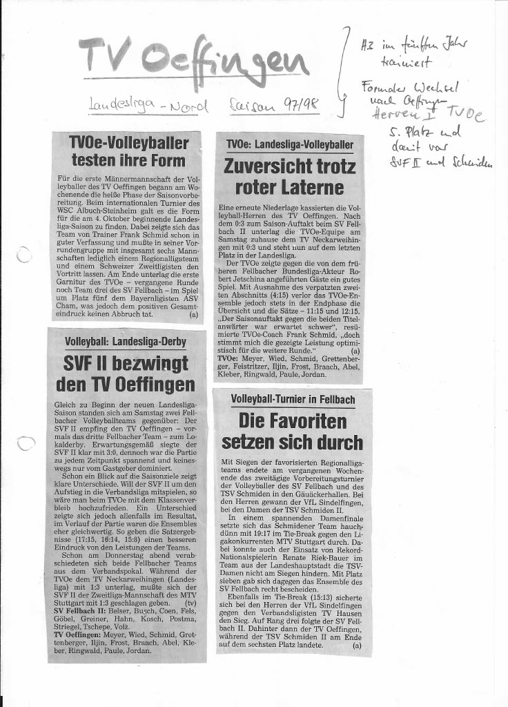 | 1997 | Frank Kölle wird Abteilungsleiter; Bau der Beachvolleyball Anlage auf dem Sportgelände Tennwengert und Einweihung anläßlich der 100-Jahr Feierlichkeiten des TV Oeffingen 1897 e.V.; aus verbandsrechtlichen Gründen wechselt die 3.Mannschaft des SV Fellbach mit Spielrecht für die Landesliga zum TV Oeffingen und wird bis zum Abstieg in 2000 für den TV Oeffingen auflaufen