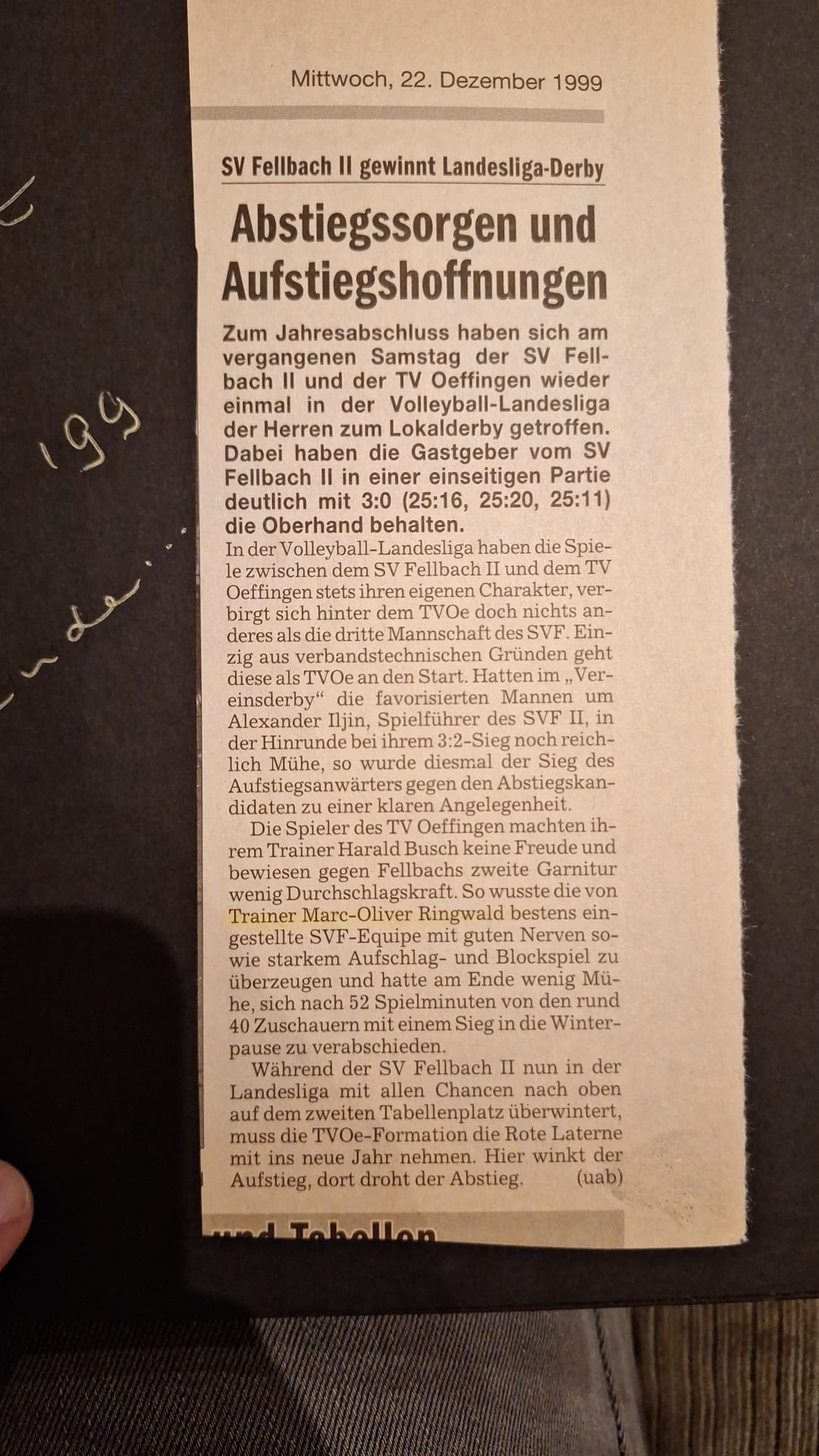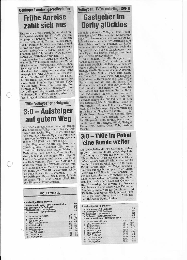 | 2000 | B-Jugend männl. wird Bezirksmeister; TV Oeffingen wird Gesellschafter in der Volleyball Fellbach GmbH; Aufstieg der 2.Herrenmannschaft; nach dem Abstieg der Landesligamannschaft erfolgt der Rückwechsel zum SV Fellbach