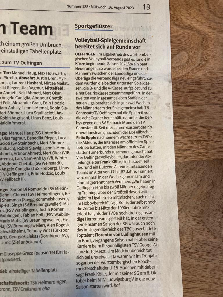 | 2023 | Meldung einer weibl. Jugend U13, U14 und U15 zum Spielbetrieb; weibl. Jugend U15 wird Württembergischer Vizemeister im Beachvolleyball und qualifiziert sich für die Deutschen Beachvolleyball Meisterschaften in Hamburg; Herrenmannschaft steigt in die B-Klasse ab